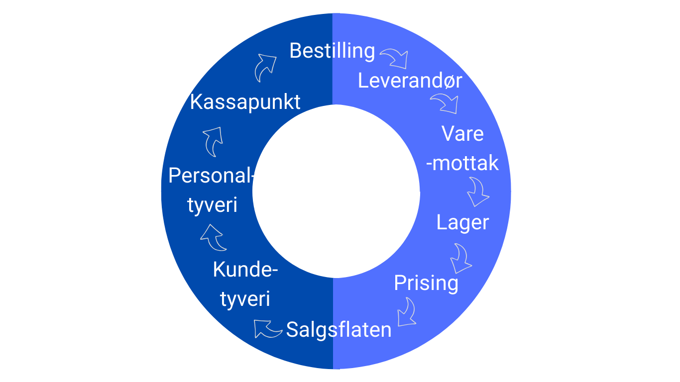 Det såkalte svinnhjulet illustrerer hvor i vareflyten svinn kan oppstå. Det viser varens «farefulle ferd» gjennom butikken – fra bestilling til den passerer kassapunktet.Bestilling